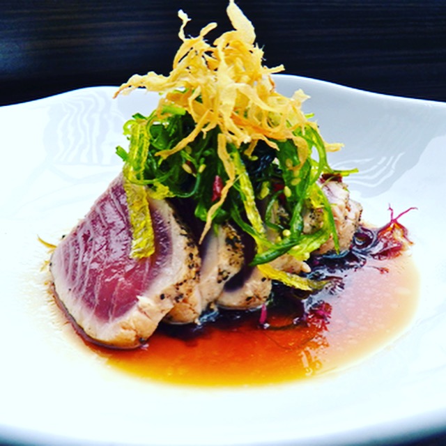 Ahi tuna, chopped Romaine lettuce, mixed greens, avocado, tomatoes, cucumbers, seaweed, white pickled ginger, chef's delicate sesame soy sauce vinaigrette.